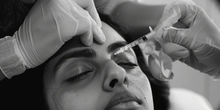 A woman receiving eyebrow treatment by a doctor. Suitable for beauty and healthcare concepts