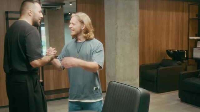 A barber expertly styles a client's hair in a contemporary barbershop setting, featuring a circular mirror and sleek decor. The atmosphere is relaxed and focused on personal grooming