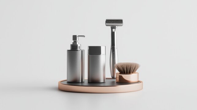 Stylish grooming essentials on a rose gold tray.  Modern, minimalist design featuring shaving products.