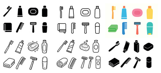 Daily morning routine items including toothbrush, toothpaste, alarm clock, and more in a simple design