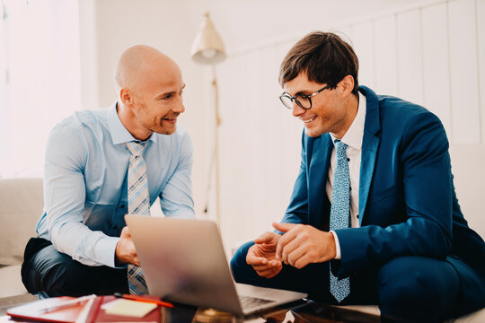 Smiling male event planner discussing with groom
