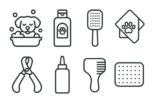 Pet grooming outline icons – linear style for animal care and veterinary services: dog bath, shampoo, brush, paw towel, clippers, ear drops, comb, mat.
