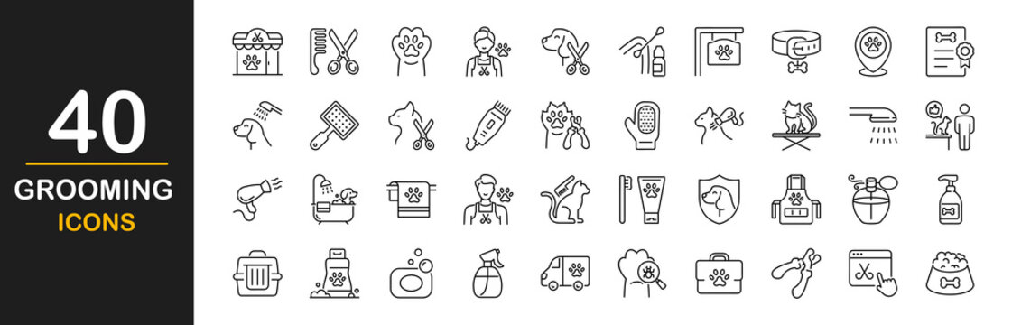 Grooming icon set. Simple set of pet grooming related vector line icons. Contains such Icons as pet-grooming, washing, teeth brushing, nail trimming, taking care of dogs and cats and more