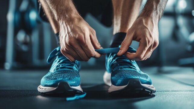 A man is getting ready for exercise. He's putting on his running shoes and tying the laces. He's preparing for cardio, fitness, or a workout in the gym.