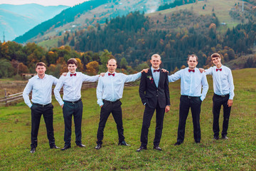young groom and his funny friends groomsman posing for camera and having fun outdoor near mountains. Group of young men with bow tie. Cheerful friends. friends outdoors. Wedding day.