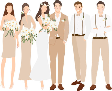 beautiful bohemian bride and groom wedding couple with bride maid and groomsman cartoon flat sytle