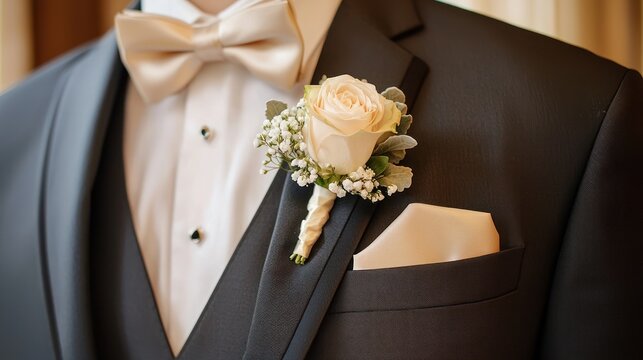 A man in a black suit with a white shirt and a white rose boutonniere on his left lapel.