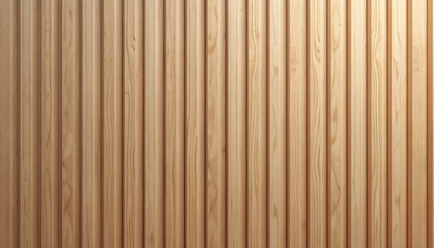 Close-up smooth light brown wood panel with vertical grain lines. Tight parallel grooved pattern creates minimalist textured surface, timber background. Interior design wall. Contemporary style.