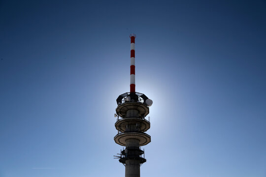 Turm auf dem Feldberg im Schwarzwald und die Sonne dahinter.
