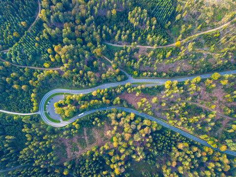 Luftaufnahme mit Drohne von der Straße der Grossen Kurve im Wald des Taunus auf dem Weg zum Sandplacken und Feldberg in der Nähe von Oberusel,