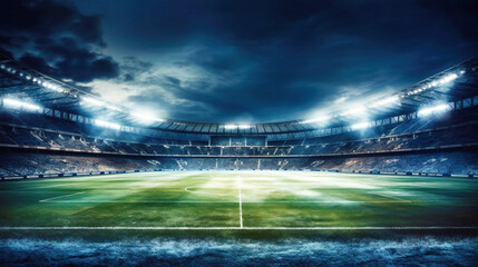 A sprawling football stadium hosting a vibrant green field surrounded by towering stands, ready for a thrilling match