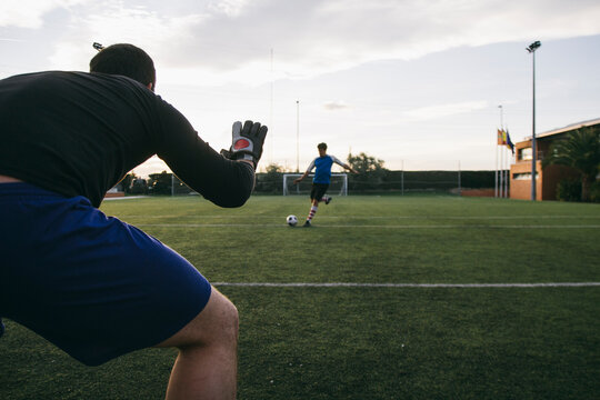 Goalkeeper prepared to stop the ball with football player kicking it in the background