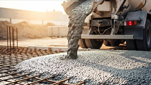 Construction worker preparing fresh mortar in a bucket with an electric mixer, building a new paved walkway outdoors