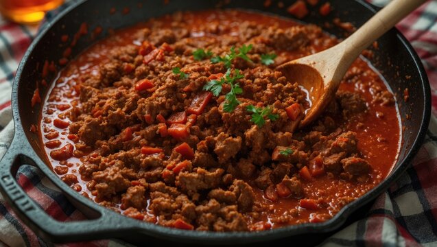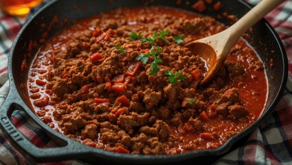 Ground meat cooked in a tomato-based sauce with chopped peppers and garnished with herbs in a skillet