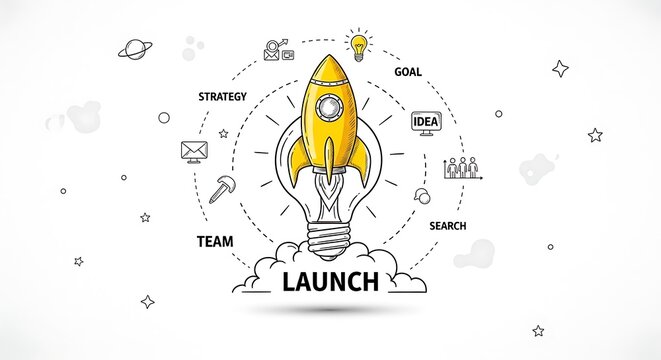 Modern line art depicting a rocket soaring from a lightbulb, embodying groundbreaking ideas, strategic planning, and rapid business growth