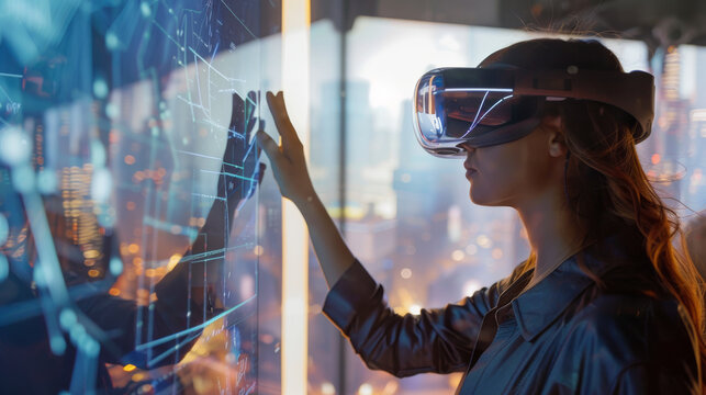 exciting educational session in which  medical student studies human anatomy using an VR headset, artificial intelligence, future technology concept. banner