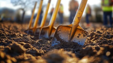 Close-up of multiple shovels stuck in freshly turned soil with people wearing safety vests in the background suggesting a groundbreaking event or construction activity