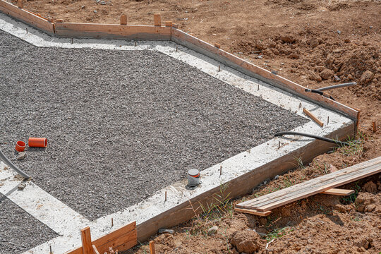 A newly poured concrete slab foundation and pathway, framed by wooden formwork and surrounded by loose gravel and brown soil on a sunny construction site.