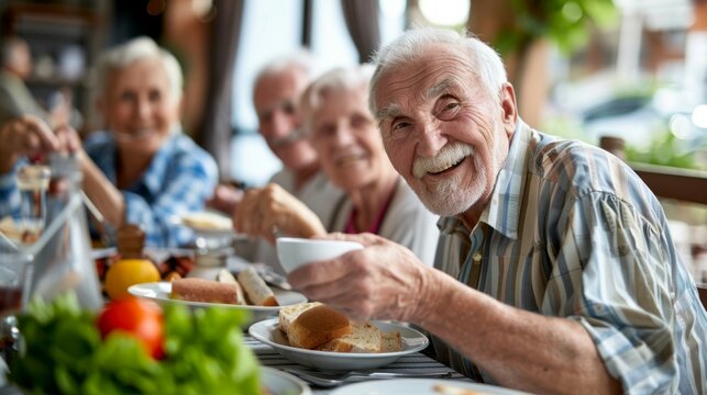 Group of senior friends with helpful carer sitting together at the table at nursing home dining room