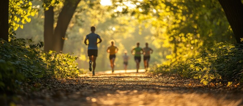 Four runners in a green forest on a path with the morning sunlight shining through the trees.