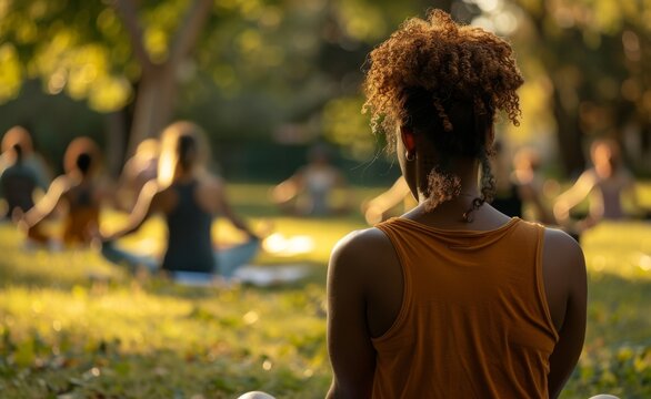 The golden light of sunset bathes a peaceful group yoga session in the park.
