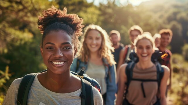A group of friends hiking and smiling, highlighting the health benefits of being active