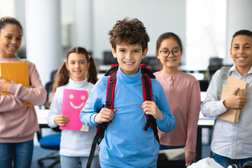 Happy diverse schoolchildren looking at camera. Smiling multiethnic kids posing for group portrait in a classroom of elementary school. Boys and girls of different skin colors go to school together.