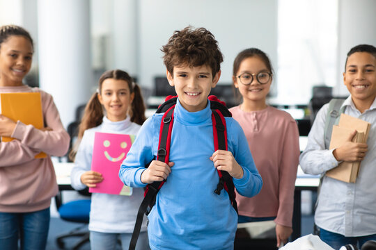 Back to school Happy diverse junior schoolchildren group looking at camera standing in classroom. Smiling multiethnic cool kids boys and girls friends posing for group portrait together