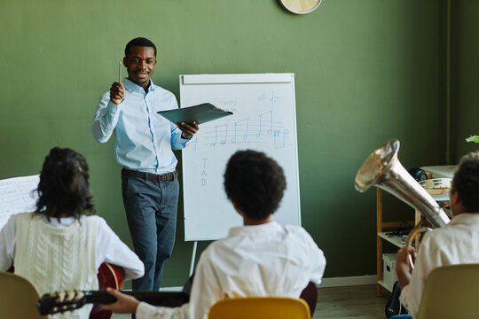 Happy young teacher of music standing by whiteboard and explaining subject to group of schoolchildren with musical instruments