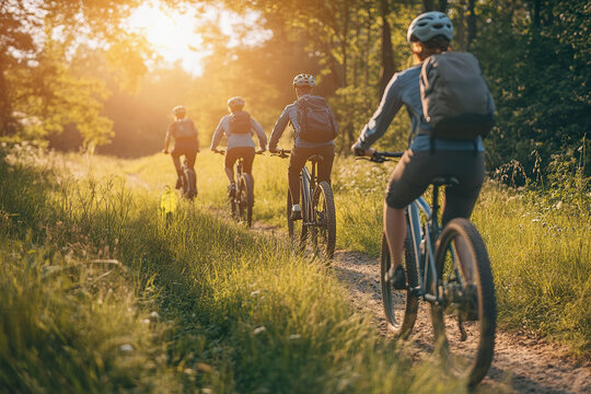 Group of Friends Mountain Biking on Forest Trail at Sunset