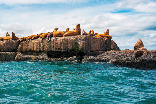 The rookery of Steller sea lions. A group of northern sea lions on a breakwater in the sea near Nevelsk City, Sakhalin Island