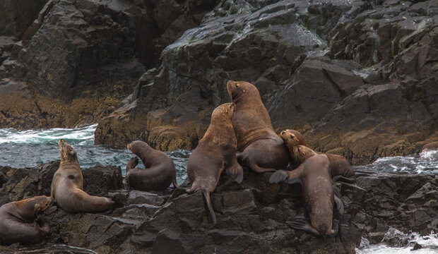The rookery of Steller sea lions. Group of northern sea lions resting on a rock. Nevelsk city, Sakhalin Island
