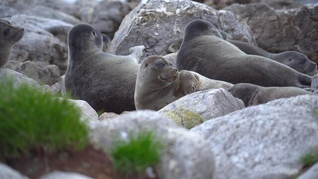 Seal nerpa lying on stone beach. Several lions of lake baikal rest relax. Lazy mammal endemic