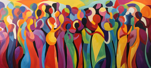 Abstract colorful art watercolor painting depicts a diverse group of people united