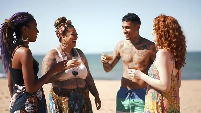 Happy group of diverse female friends having fun, walking along beach holding hands and laughing