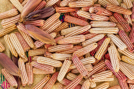 red and yellow corns grouped on a mat in Oaxaca