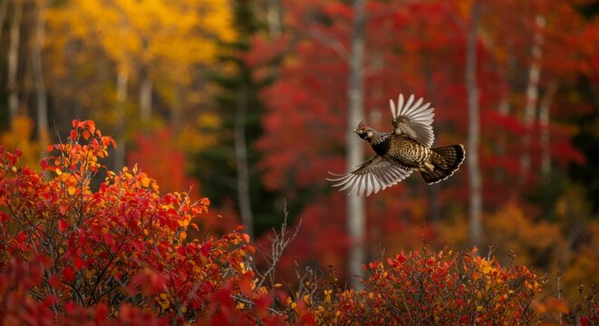 Grouse in flight amidst vibrant fall foliage