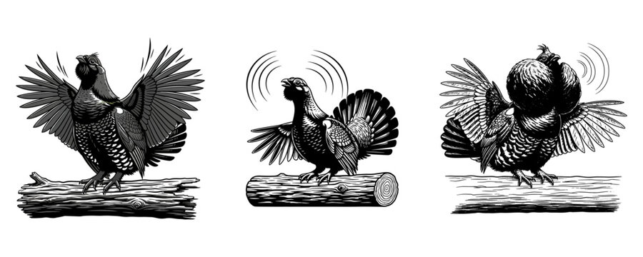 Set of Drumming Grouse or Capercaillie Bird Courtship Display Illustrations