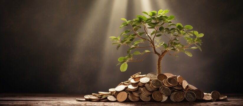 Coin tree on wooden surface with illuminated leaves, financial growth concept.