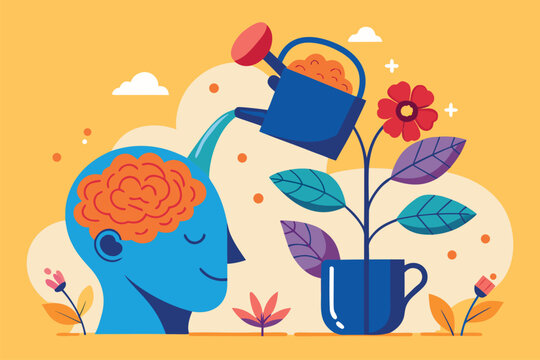Human brain nurtured by a watering can, illustrating creativity and growth through the symbolism of a blooming flower against a cheerful background