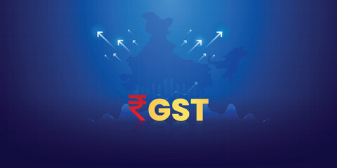 Goods and Services Tax India, GST with Indian rupee symbol, abstract background with GST tax slabs illustration, GST finance background with stock market data, rupee currency