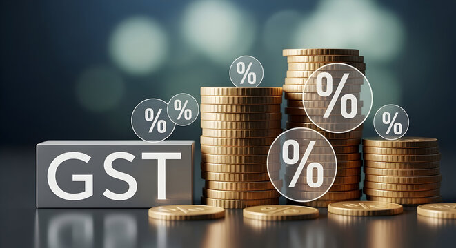 Stacks of gold coins with percent symbols above and white block labeled “GST” — tax rate increase concept, percentages, financial burden and revenue illustration