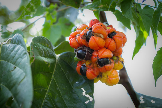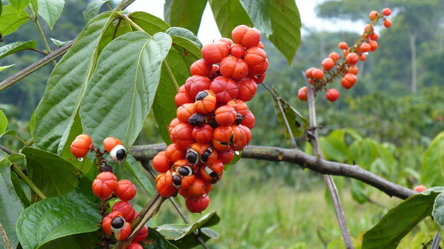 view of Guarana fruits growing in the plantation,close-up of red with black Guarana fruits