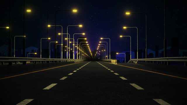 Empty 3D Rendered Stylized Road at Night with Cityscape Background