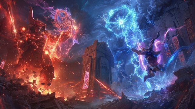 A feminine silhouette of a knight girl with a shield on which a crescent moon and a golden glowing sword, she has long magical hair, against the background of a bright sunset. 2d oil illustration