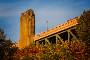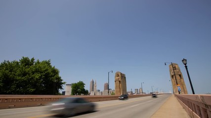 Guardians of Transportation in Cleveland, Ohio on a sunny day with fast cars driving by. Ohio city brewery district facing the guardians of traffic overlooking downtown with a blue sky.