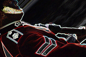 British army guard in red tunic and bearskin on parade at the Trooping of the Colour event in London