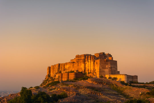 Sunrise view of Mehrangarh Fort, one of India's largest forts offers a lift and galleries, plus guided tours & shops from Jodhpur the Blue City, Rajasthan, India