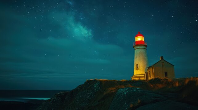Luminous lighthouse guiding under starry night sky. The beam of light illuminates the serene ocean horizon while stars and the Milky Way shine above.