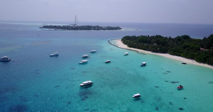 Drone flying over tour boats and yachts anchored on calm lagoon in Louisiade Archipelago, Papua New Guines